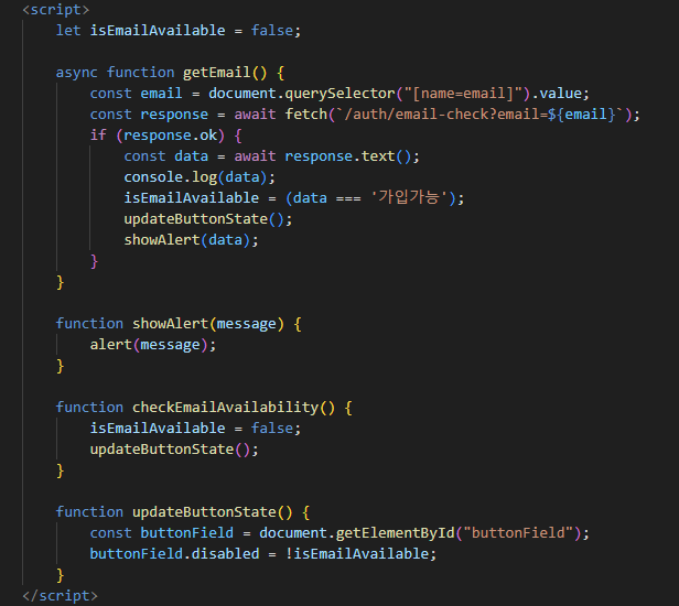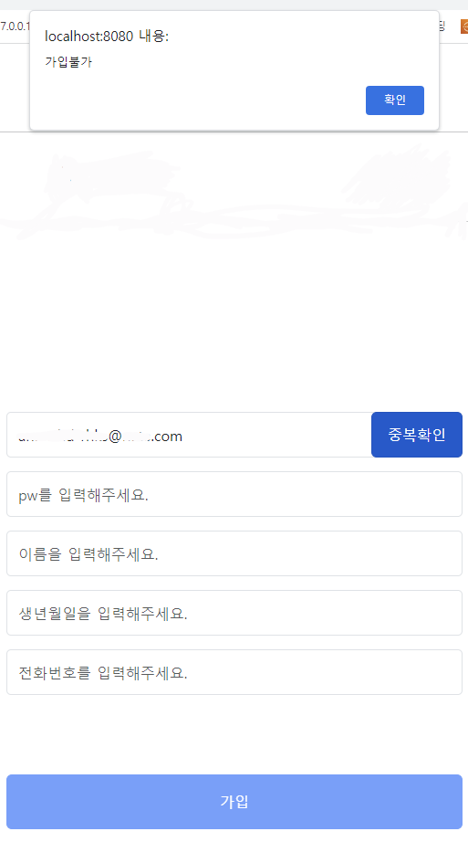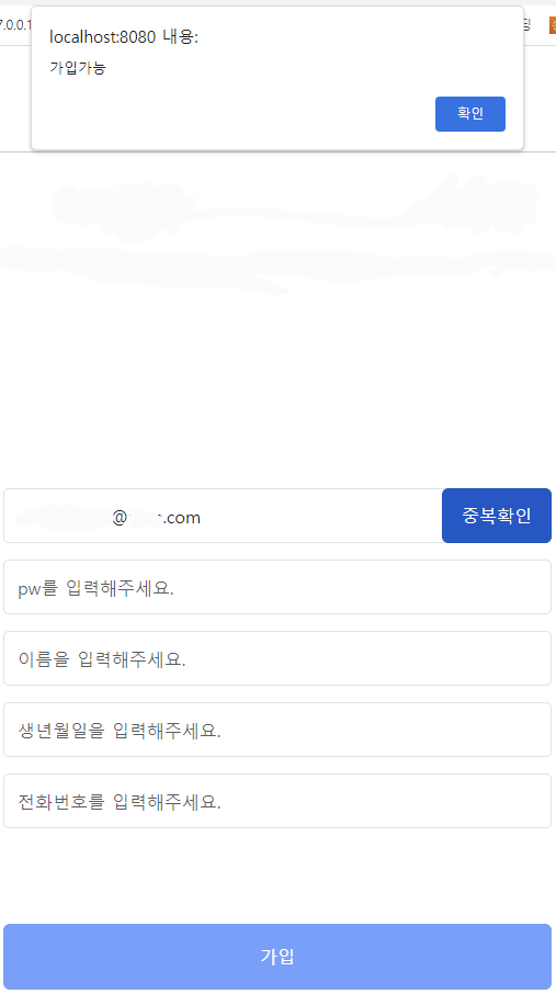 이메일 중복검사결과 데이터베이스에 중복된 이메일이 있다면 가입불가 알람이뜨며 가입버튼이 비활성화 상태며, 없다면 가입가능 이라는 알림과 함께 가입 버튼이 활성화 되도록 했다.