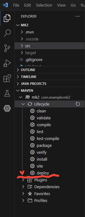 우선 vscode에서 빌드를 마치고 난 뒤 좌측의 MAVEN을 드롭다운 해보면 프로젝트명, 그아래로 다양한 메뉴들이 있는데 그 중 LifeCycle 그 아래 deploy라는 메뉴를 볼 수 있다.