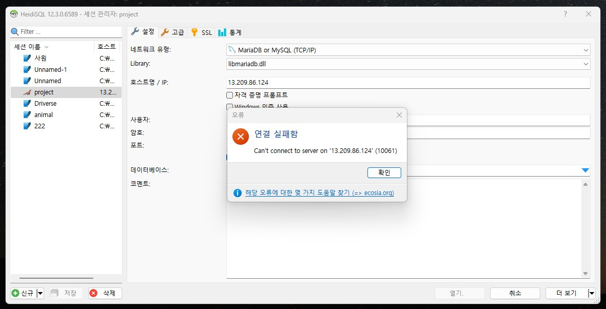 원격서버에 연결된 데이터베이스를 사용하고 있었기 때문인지 자꾸 db 연결에 실패한다는 오류와 함께 (10061)이라는 에러 코드가 나왔다.