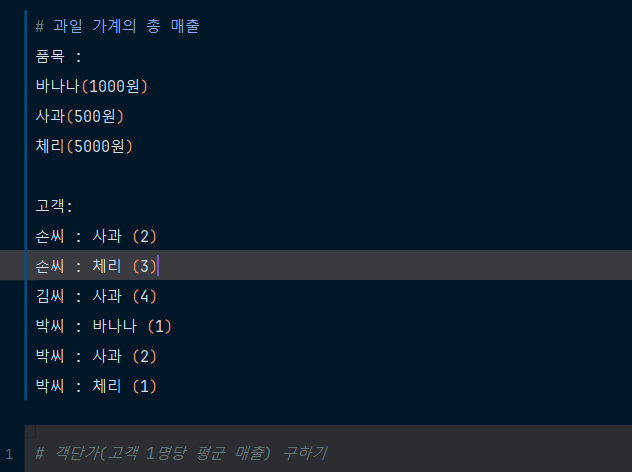 2. 객단가를 구하기 위해서는 각각의 고객이 사간 과일 금액의 합이 필요하기 때문에 손님을 변수로 놓은 뒤 변수로 놓은 과일 가격의 합을 구해준다.