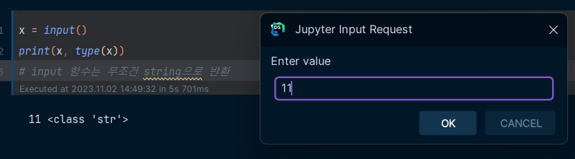 input 함수를 사용하게 되면 실행 시 값을 입력할 수 있는 공간이 생기며 입력한 값에 따라 결과가 변한다.