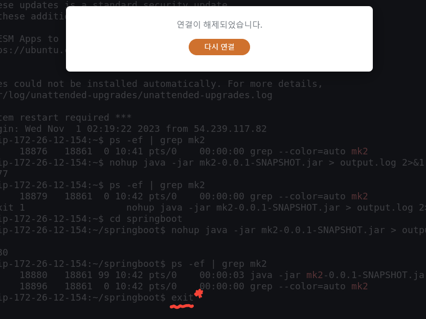 여기저기 찾아보다 발견한 방법이 ssh 콘솔창을 닫을 때 x를 눌러서 닫지 말고 명령어 exit를 입력해서 닫는 방법이다.