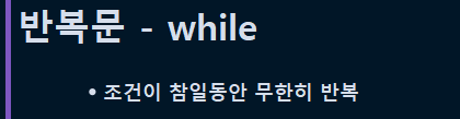 while과 while True 둘의 결과는 같다. 차이점이라면 while True 사용시에는 break로 루프를 끝내주어야 한다.