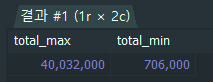 앞서 만들었던 회원별 지출 총액을 하나의 테이블처럼 사용해서 그 테이블 내에서 max() 함수와 min() 함수를 사용해서