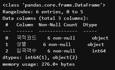 - (**중요**) => info() 함수는 데이터의 결측치(nan, NuLL) 데이터
