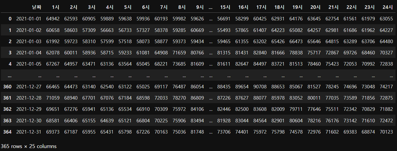 result_df = pd.DataFrame(columns=["년도", "시간", "전력량"])