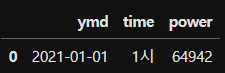 결과 : {'ymd': '2021-01-01', 'time': '1시', 'power': 64942}