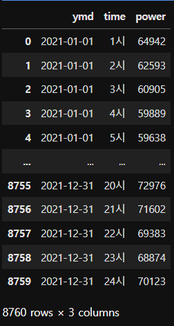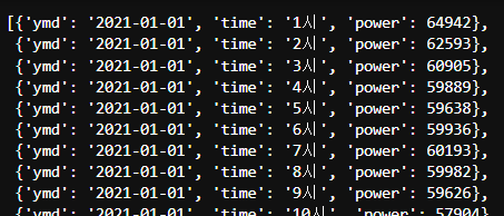 결과 : {'ymd': '2021-01-01', 'time': '1시', 'power': 64942}