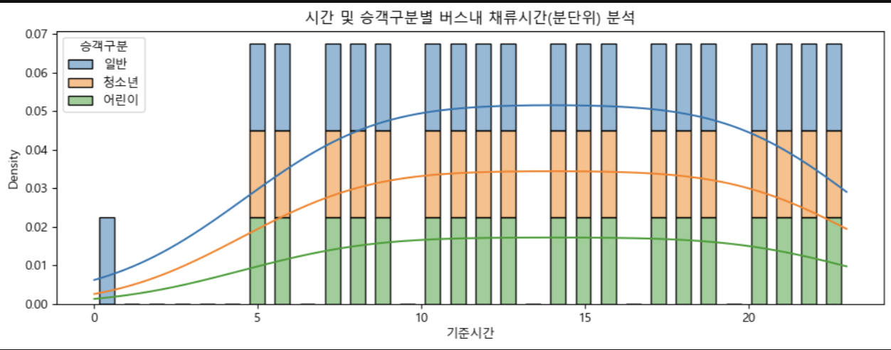- 시간 및 승객구분별 버스 내 채류시간(분단위) 분석 (histplot 시각화)