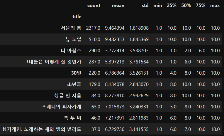 딕셔너리 최종값 : {'서울의 봄': 9.464393612429866, '그대들은 어떻게 살 것인가': 5.397212543554007, '더 마블스': 3.7724137931034485, '프레디의 피자가게': 7.015873015873016, '소년들': 8.134078212290502, '30일': 6.786363636363636, '톡 투 미': 7.217391304347826, '헝거게임: 노래하는 새와 뱀의 발라드': 6.72972972972973, '뉴 노멀': 9.48235294117647, '싱글 인 서울': 8.273809523809524}
