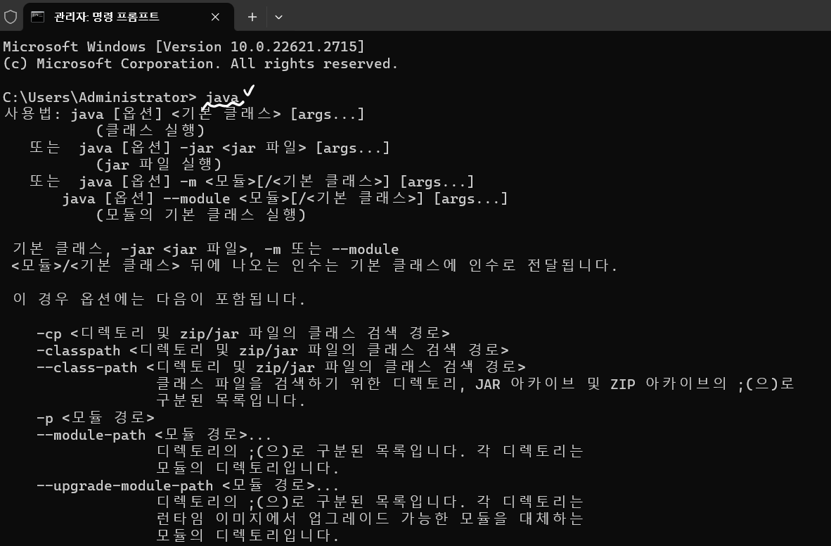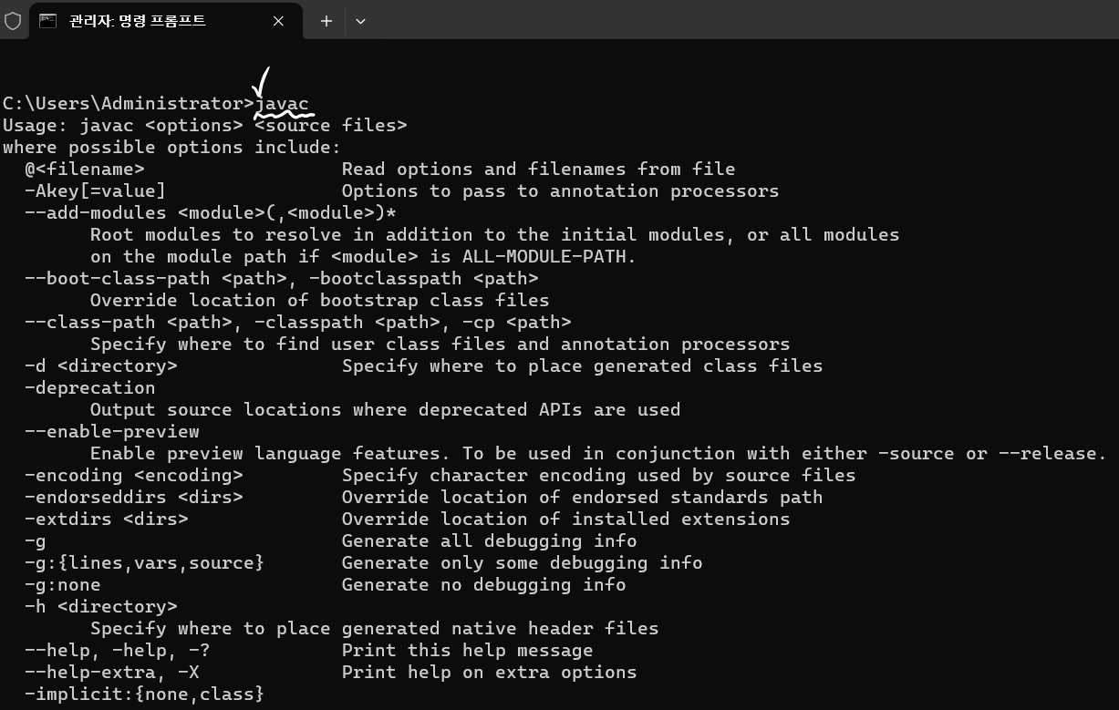 명령 프롬프트에서 java와 javac를 타이핑했을 때 이런 화면이 나온다면 환경변수 설정이 정상적으로 완료되었다.
