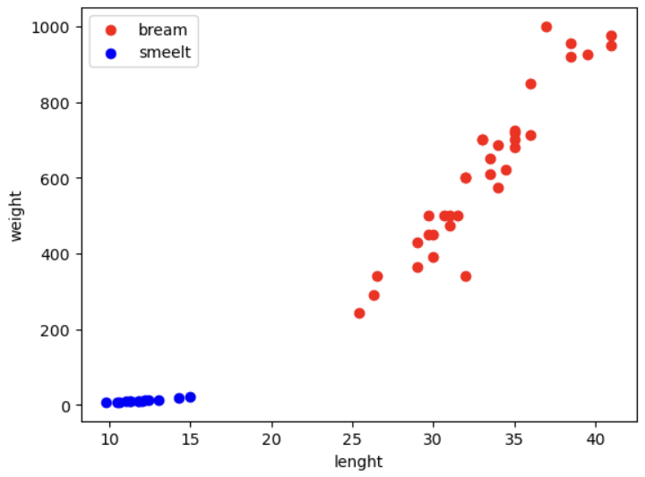 - 도미와 빙어 모두 우상향 분포를 나타내고 있으며, 도미 데이터는 경사가 급한 반면, 방어 데이터는 경사가 완만하게 분포되어 있음,