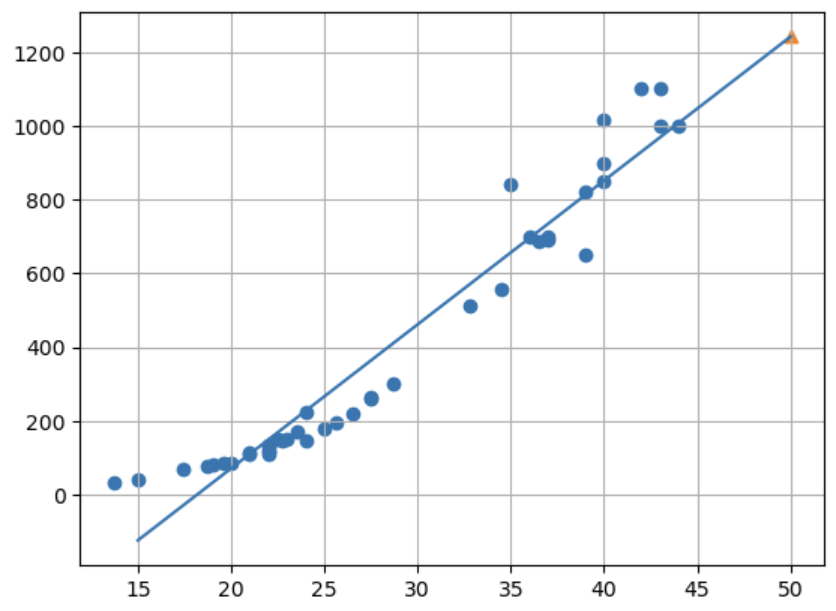 plt.plot([15, 50], [lr.coef_ * 15 + lr.intercept_,
