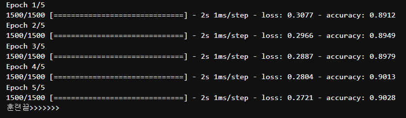 history = models.fit(train_scaled, train_target, epochs=5, verbose=1)